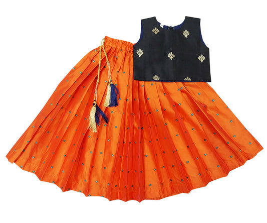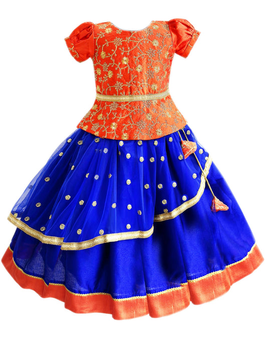 Stanwells Kids Girls Orange & Magenta Mirror Work Flared Net Sleeveless Lehenga Choli Set Pattupavadai for Girls