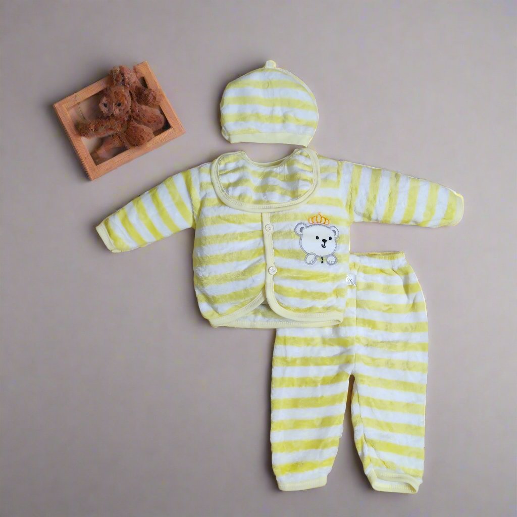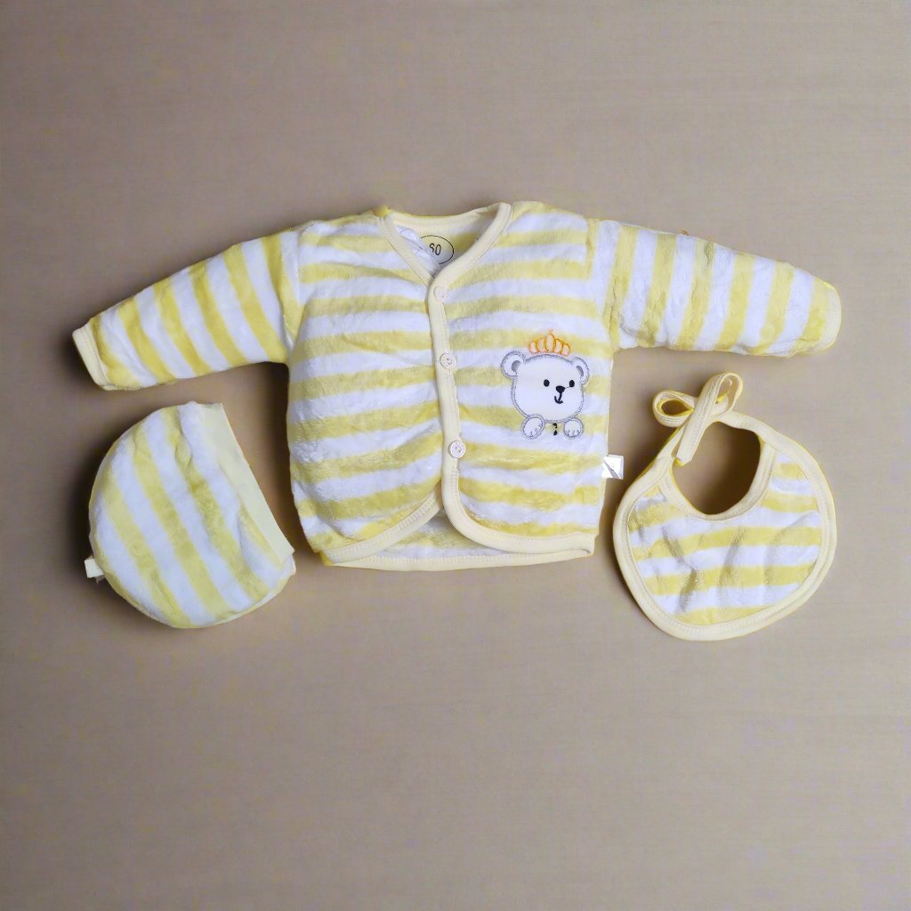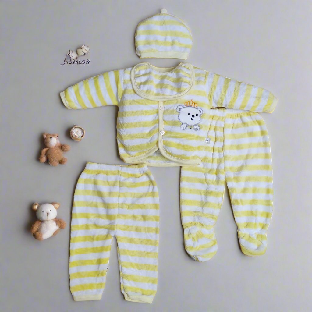 Introducing the perfect clothing set for your little one, featuring a delightful light yellow and white color palette that adds charm to any outfit. This ensemble includes a cozy jacket adorned with a playful bear print, which delivers both comfort and style.