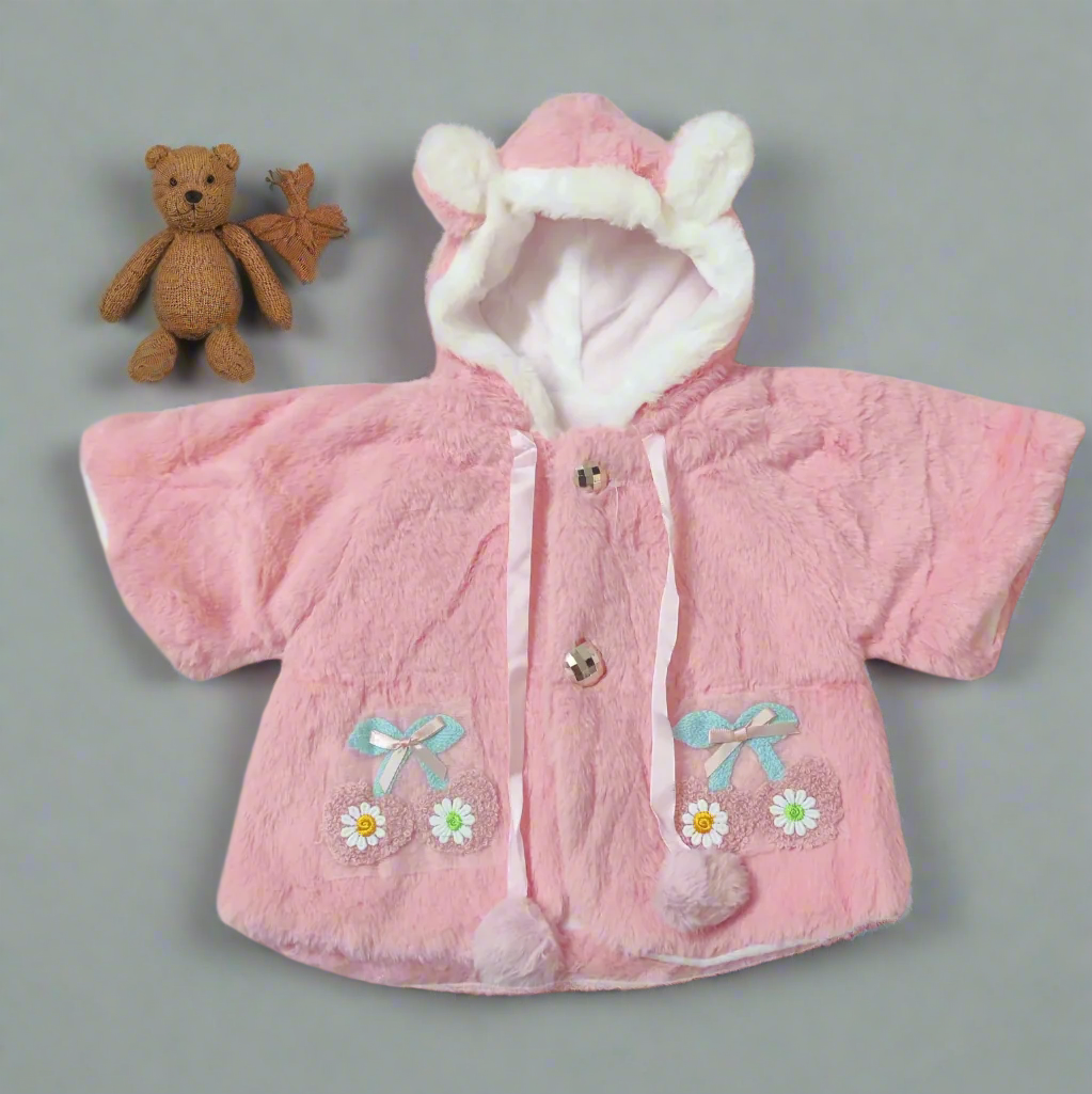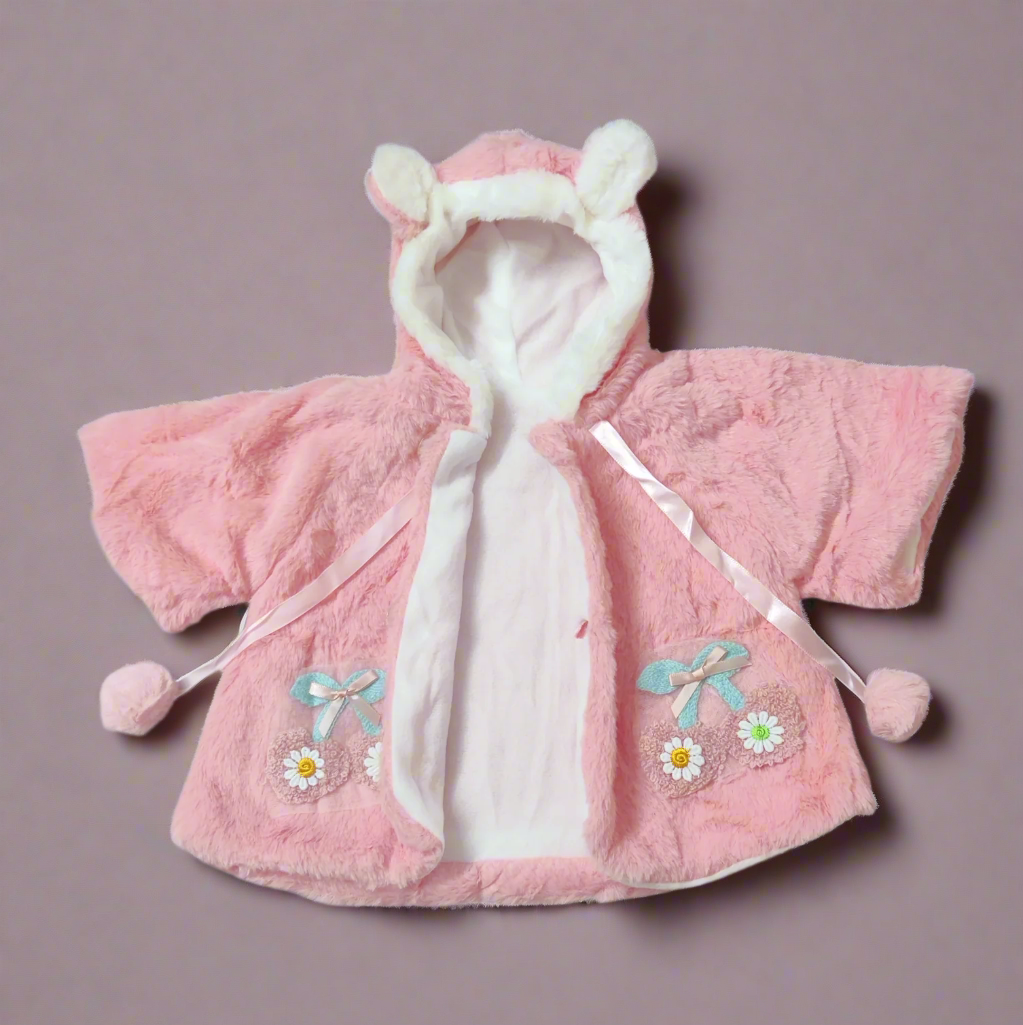 Crafted from soft plush fabric, the jacket offers warmth and comfort, perfect for chilly days. Its enchanting pink and white color scheme features decorative flowers and bows, bringing a touch of whimsy that children adore.
