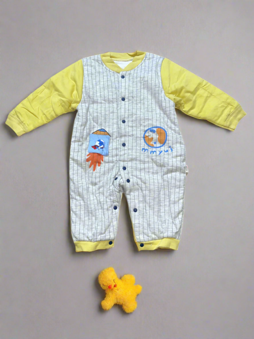 Meet your little one's new favorite outfit! This charming yellow and white striped onesie is perfect for keeping your baby stylish and comfortable throughout the day. The long sleeves offer warmth and snugness, ensuring your baby stays cozy during cooler weather.