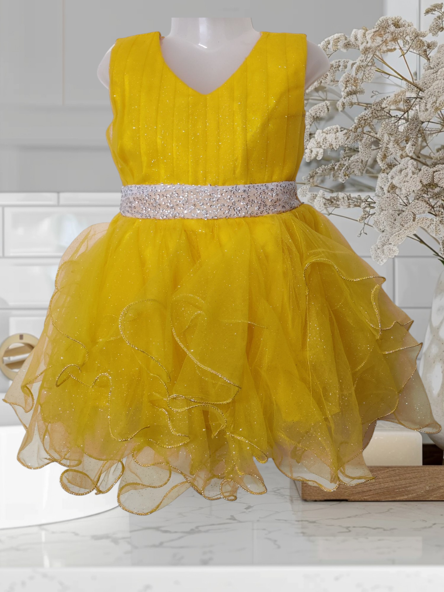 Bring a burst of sunshine to your child's wardrobe with this delightful Yellow Tutu Dress. Crafted from soft, lightweight tulle and elegant glitter fabric, this dress is designed to twirl with every step, making it perfect for dance parties, birthdays, or just a fun day out.