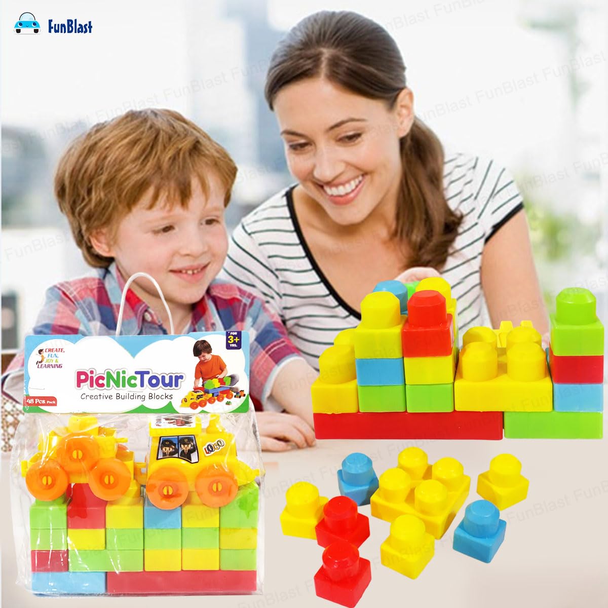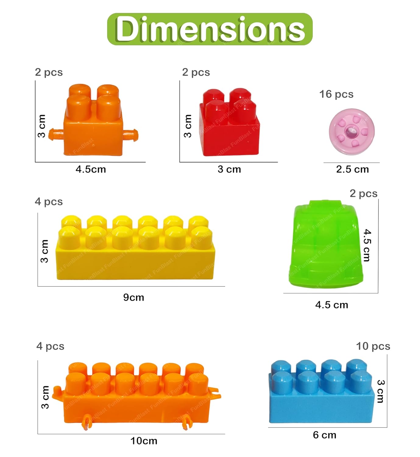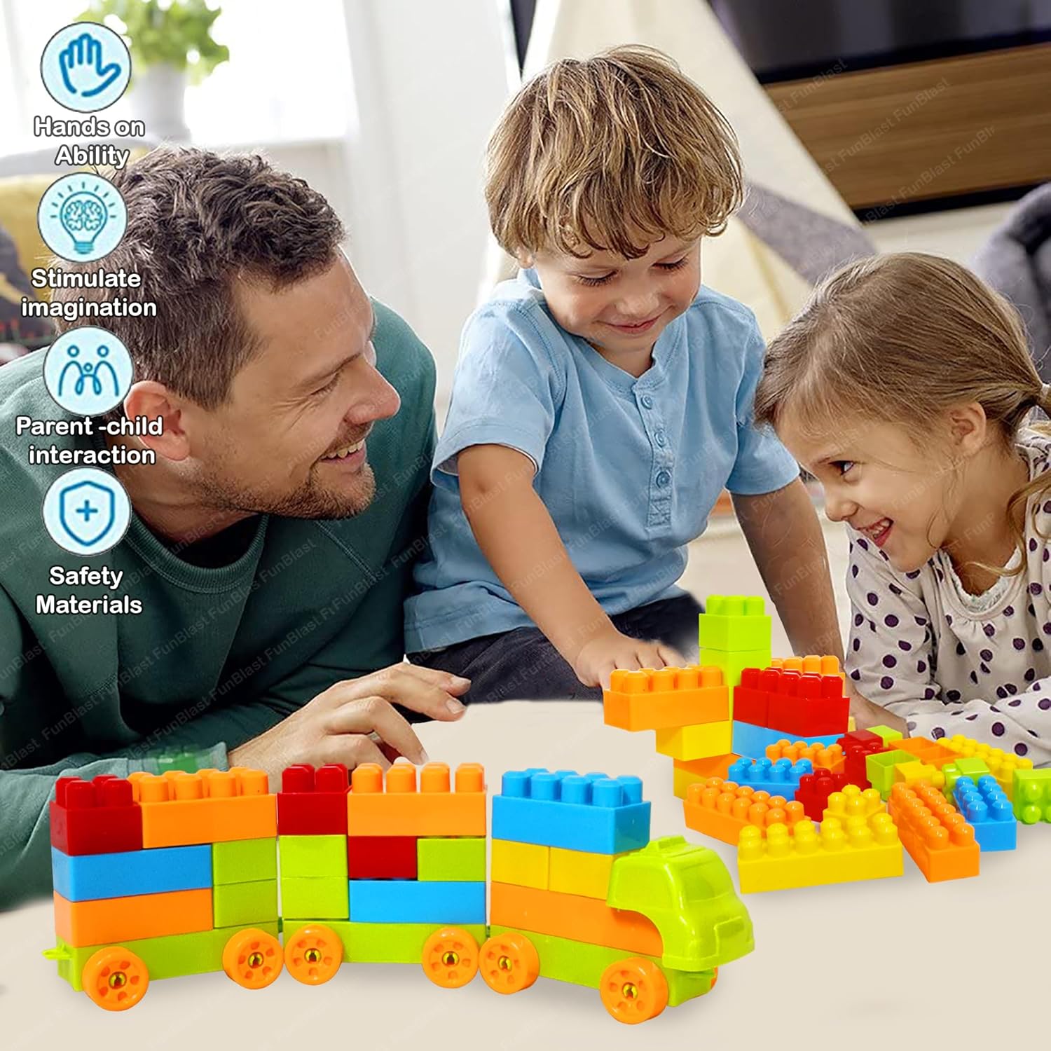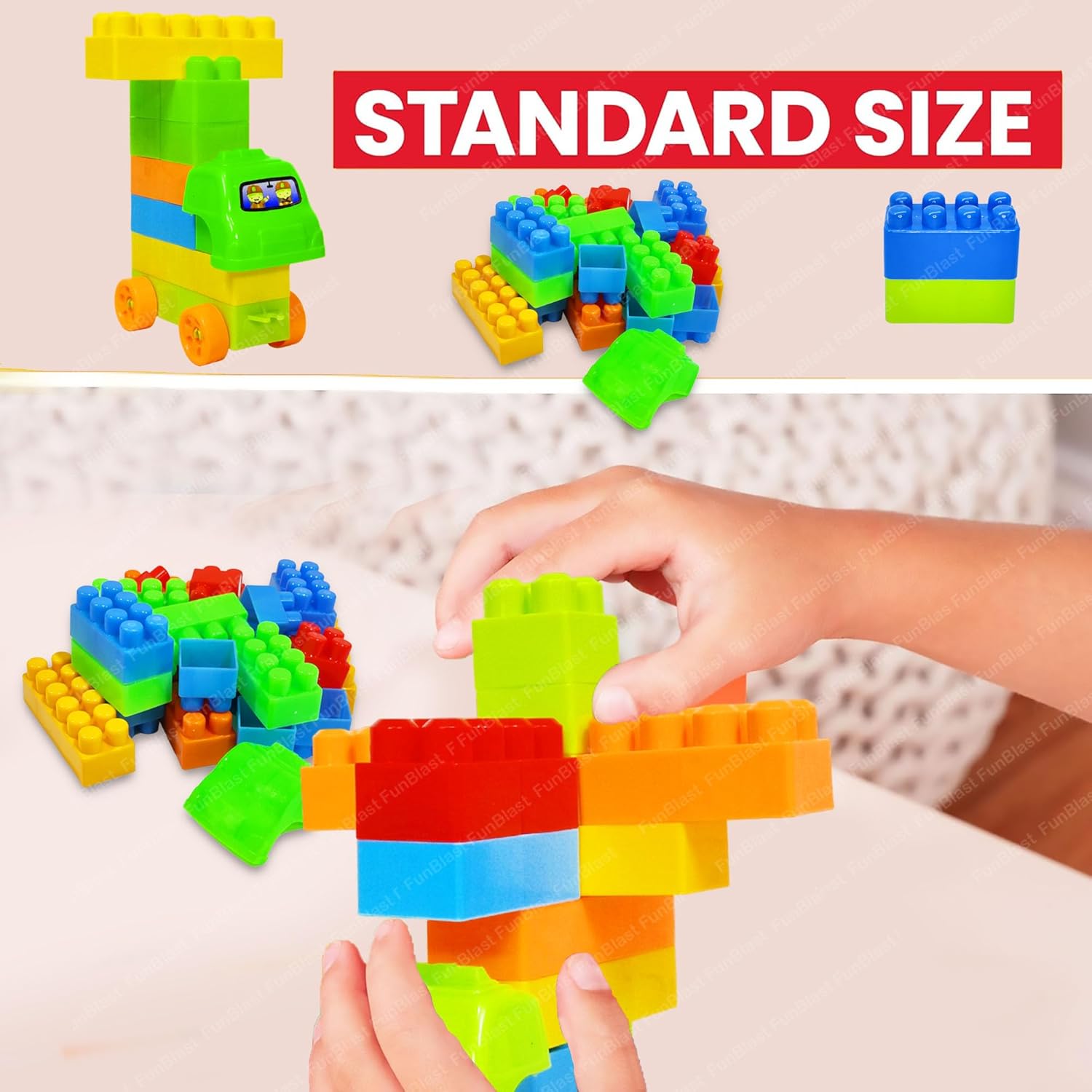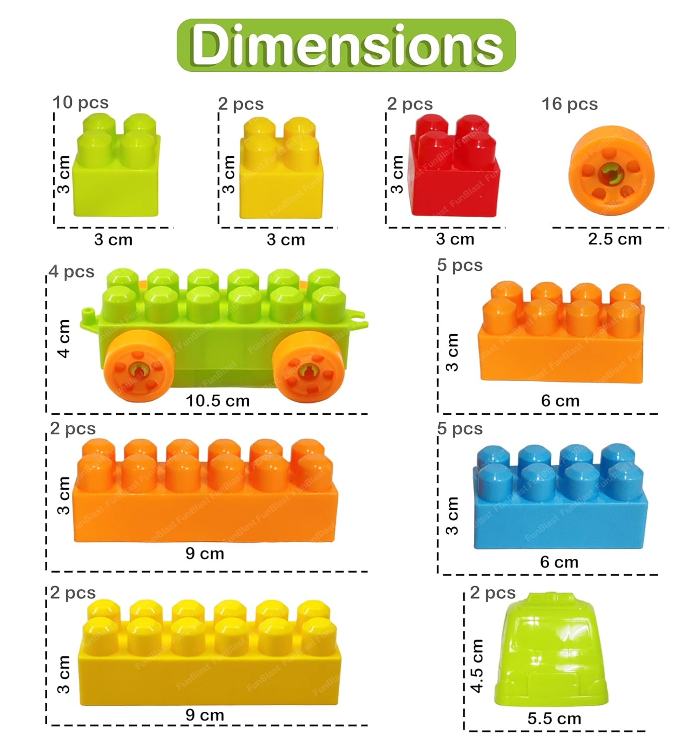 FunBlast DIY Plastic Building Blocks for Kids Building Blocks Toy for Kids Puzzle Games for Kids, Toys for Children Educational & Learning Toy for Kids, Girls & Boys - (250+ Blocks with 38 Wheels) -Made in India Kids Block Toy - In the Bag - Building Blocks Includes 250+ blocks with 38 wheels for kids. Recommended Age - 3+ Year Kids Toys Puzzles - An amazing variety of shapes, sizes and colors for easy sorting, counting, patterns, stacking and playing, creating attractive models like bus chairs, house, robot toy, car toy, aero plane, train. Kids Puzzle Blocks - This puzzle block comes in a box, which makes it very convenient to store the blocks and move them from one place to another. Great preschool toddler toy for kids to learn. Early Development Toys - Perfect for promoting children's fine motor skills, stimulates imagination and creativity, develops hand-eye coordination and logic thinking, builds confidence. Safe & durable material - This building block set is made of high quality and durable plastic, which is safe for children.