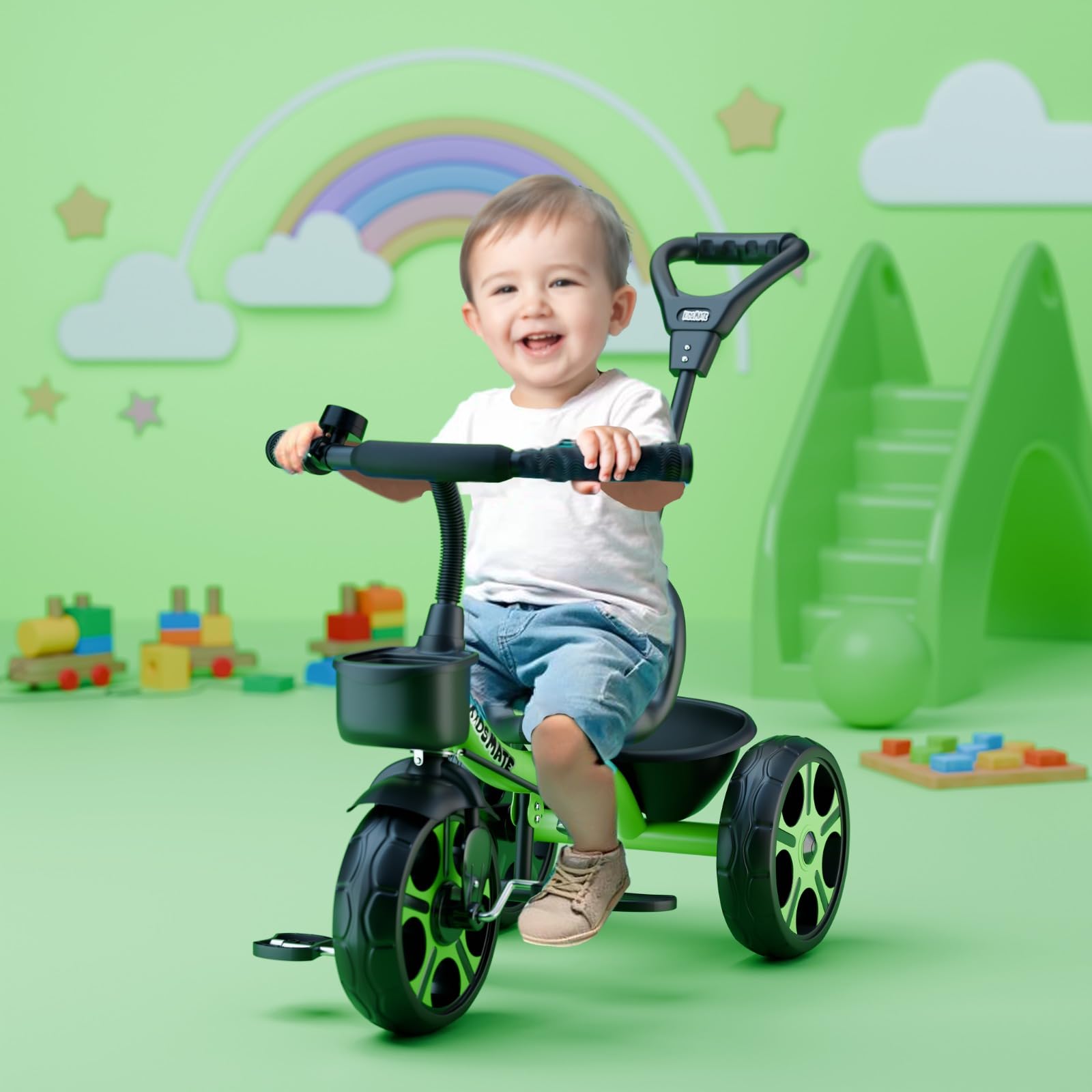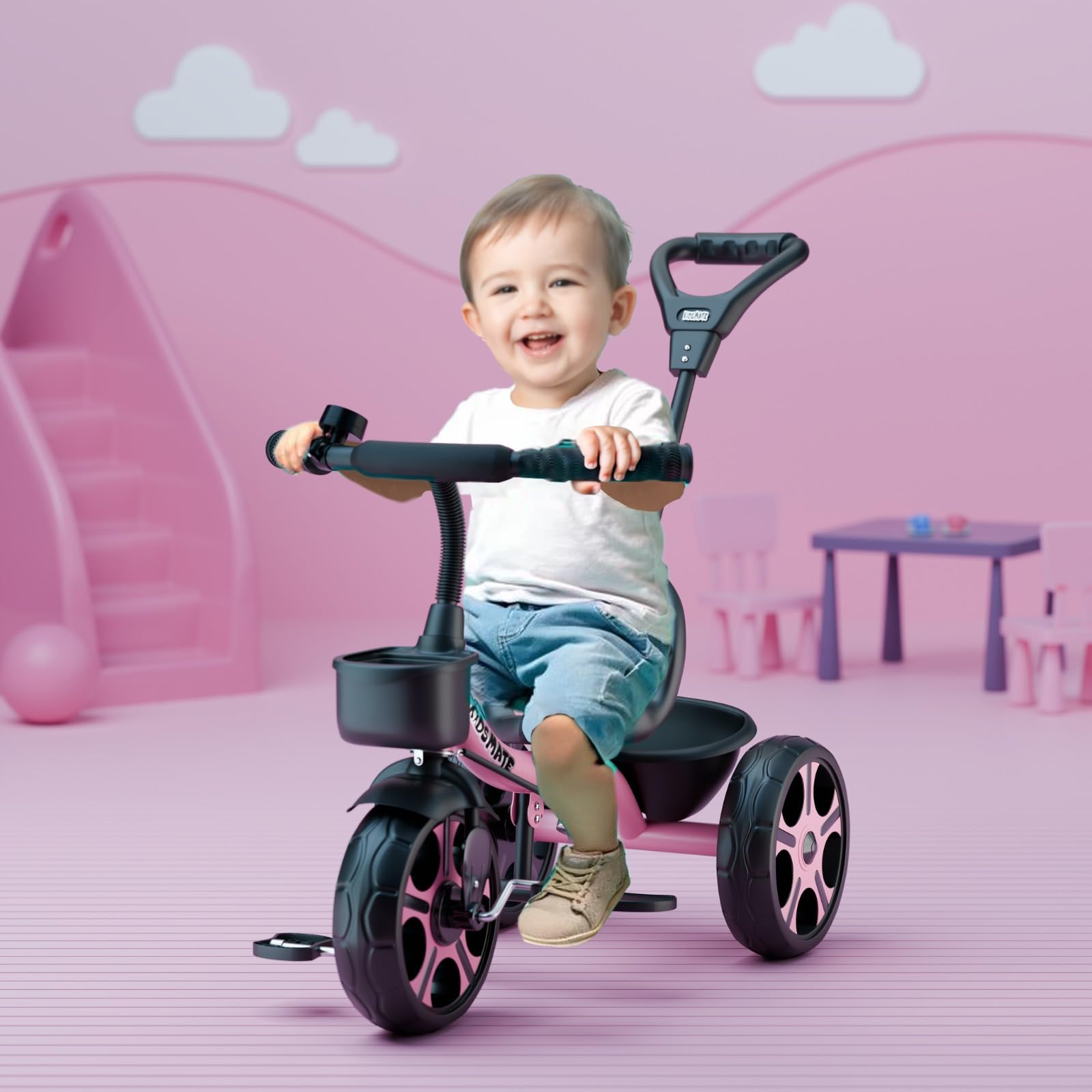 - 👶 PARENTAL CONTROL HANDLE – The plug & play tricycle comes with an ergonomic push handle, allowing parents to steer easily while kids enjoy the ride.