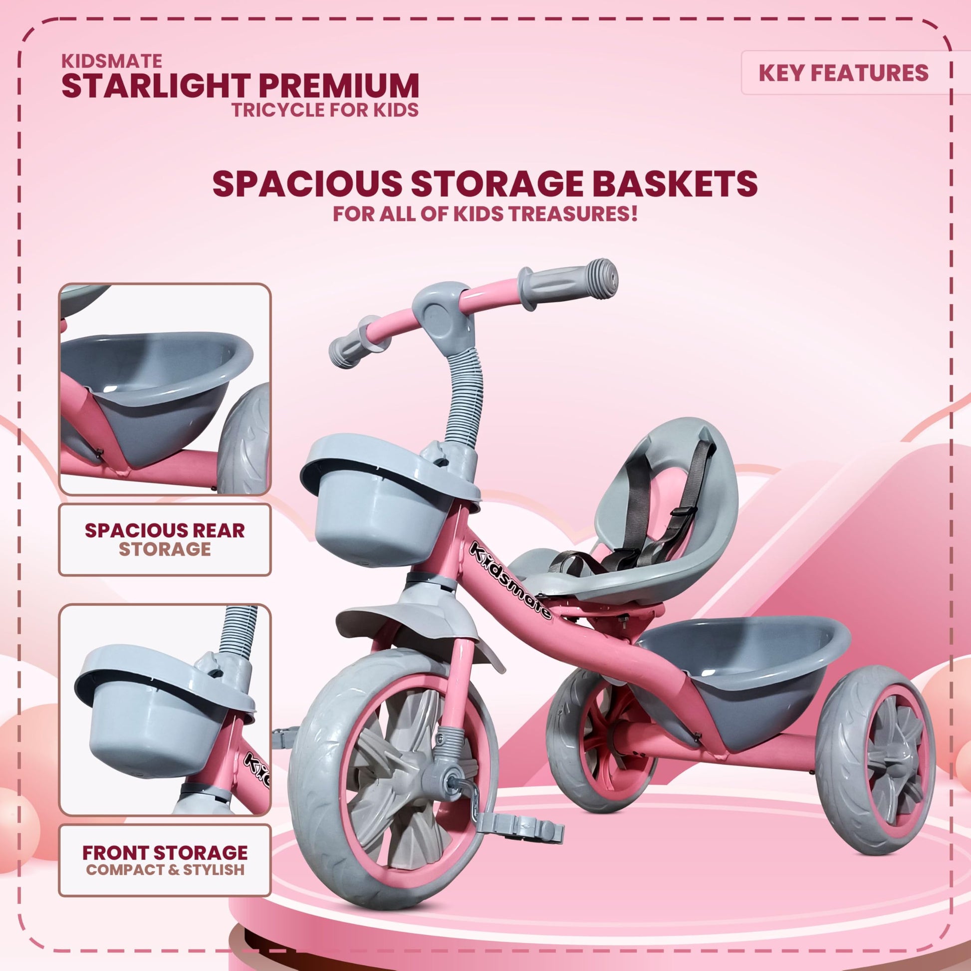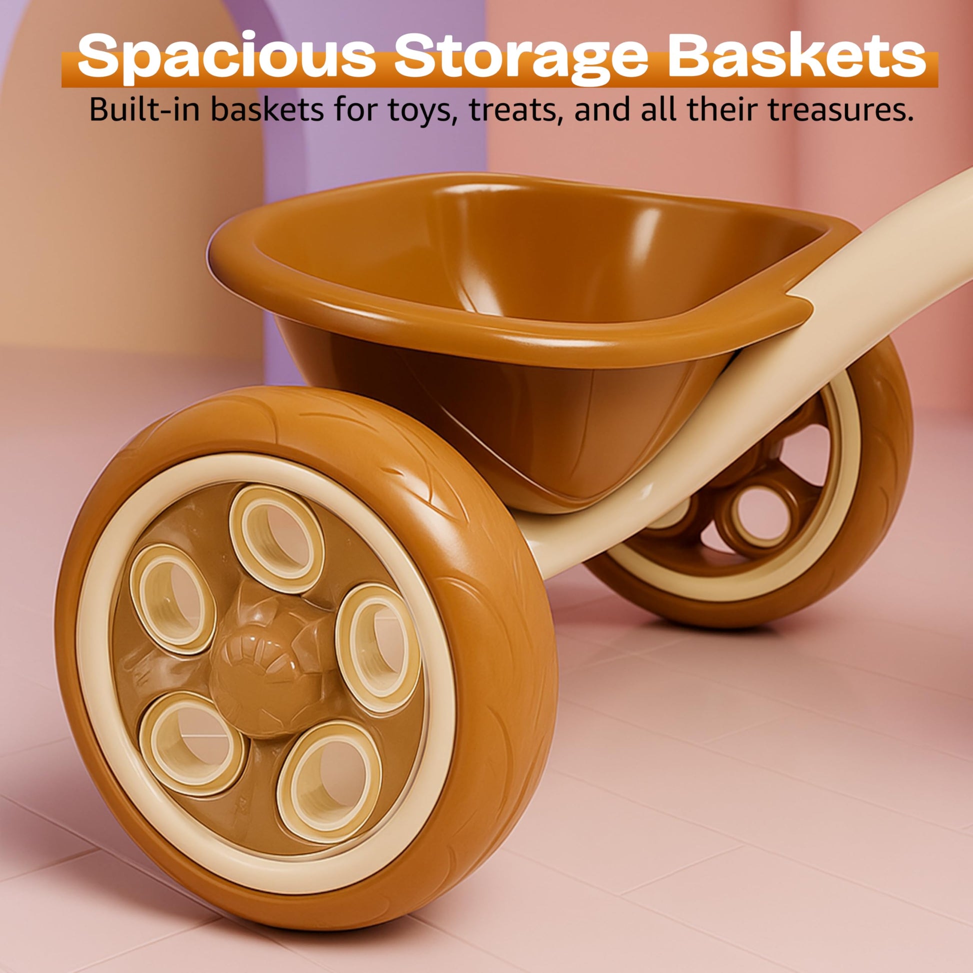 - 🛒 CONVENIENT STORAGE SPACE – A front basket and rear storage make this tricycle perfect for carrying toys, snacks, or essentials during rides.
